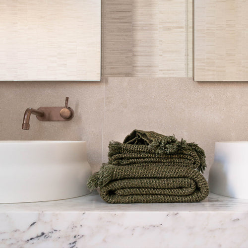 Elevate your daily bathing routine with our best-selling Flocca Linen Towels. Pictured here in rich Armee, reminiscent of lush remote pastures likened to a deep Khaki.
